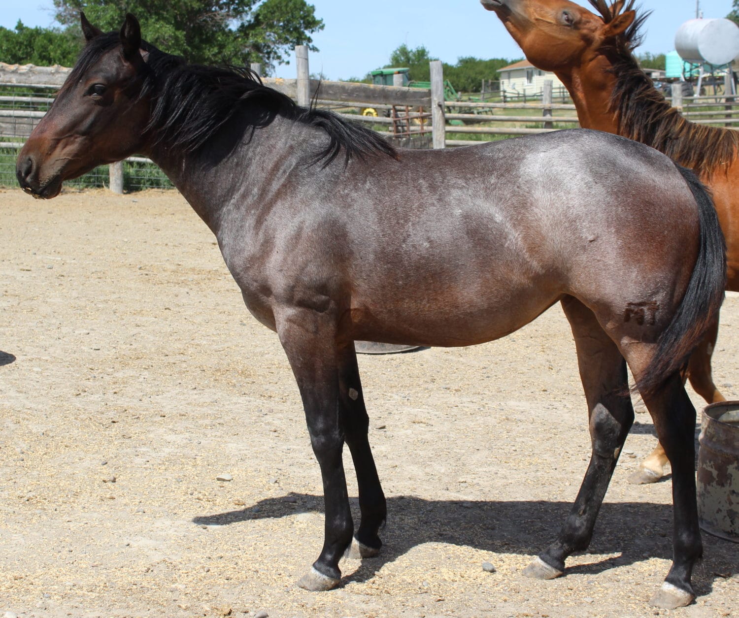 Such a beautiful filly. This is a first time cross and it looks terrific. This filly’s dam is not only pretty, but very smart and capable. She is quickly becoming a super producer for us. Spirit adds cow, color and dimension to this very nice filly. This is a cross we plan to make again. If we had the grass, we would keep her. There’s just something special about this shimmering roan lady.