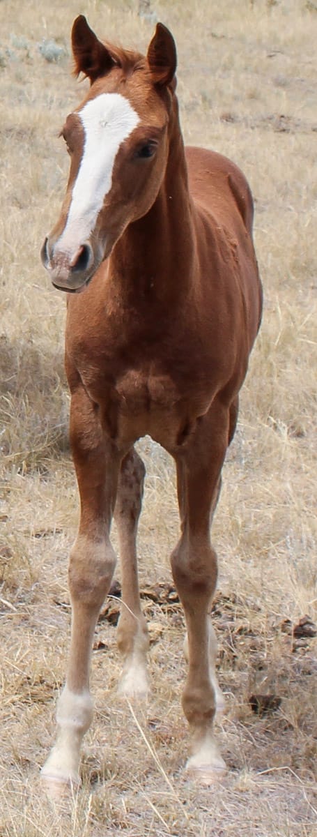 This is always an incredible cross. Even though she isn’t the usual roan, you won’t notice her lack of color when you ride her and excel in everything you ask her to do. This is a cross that works well every time. Heavenly is the one who comes to say hi and check you out when you enter the pen. Her sweet curiosity is charming.