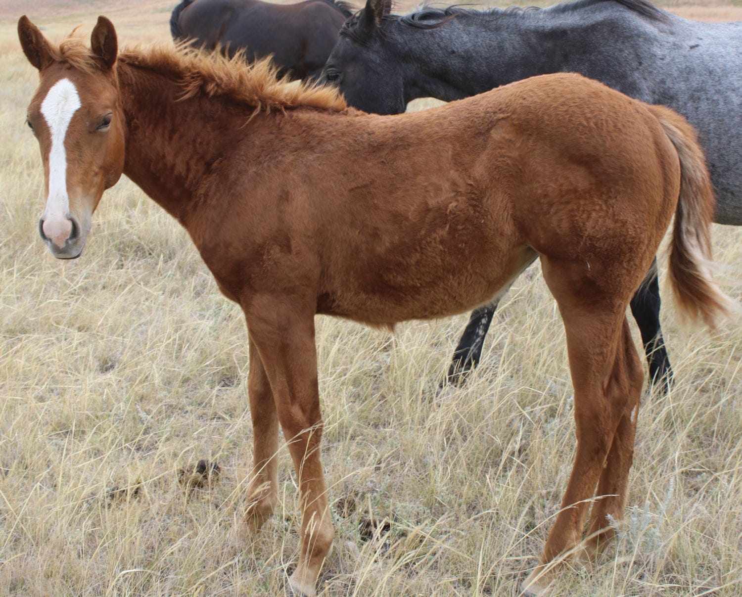 Super built filly with a pedigree to match. Just look at the pushers on this girl. She has lots of blue roan genetics in her pedigree so I was very surprised to see a sorrel. She has several homozygous blue roan full brothers standing at stud. We have a blue roan sister coming up in our program. Rain is cowy & smart and solidly built. Look at her ideal conformation. She is begging for attention and would be so good to start under saddle. Everyone loves her siblings. We have 2 full sisters and the year is dry with grasshoppers again so we are doing something different in offering bred YOUNG mares. We offer this beautiful mare as bred and ready to start under saddle. Confirmed in foal to LHR Dun VintageSmoke (Vince) for a 2026 foal. Vet report = bred June, 2025.