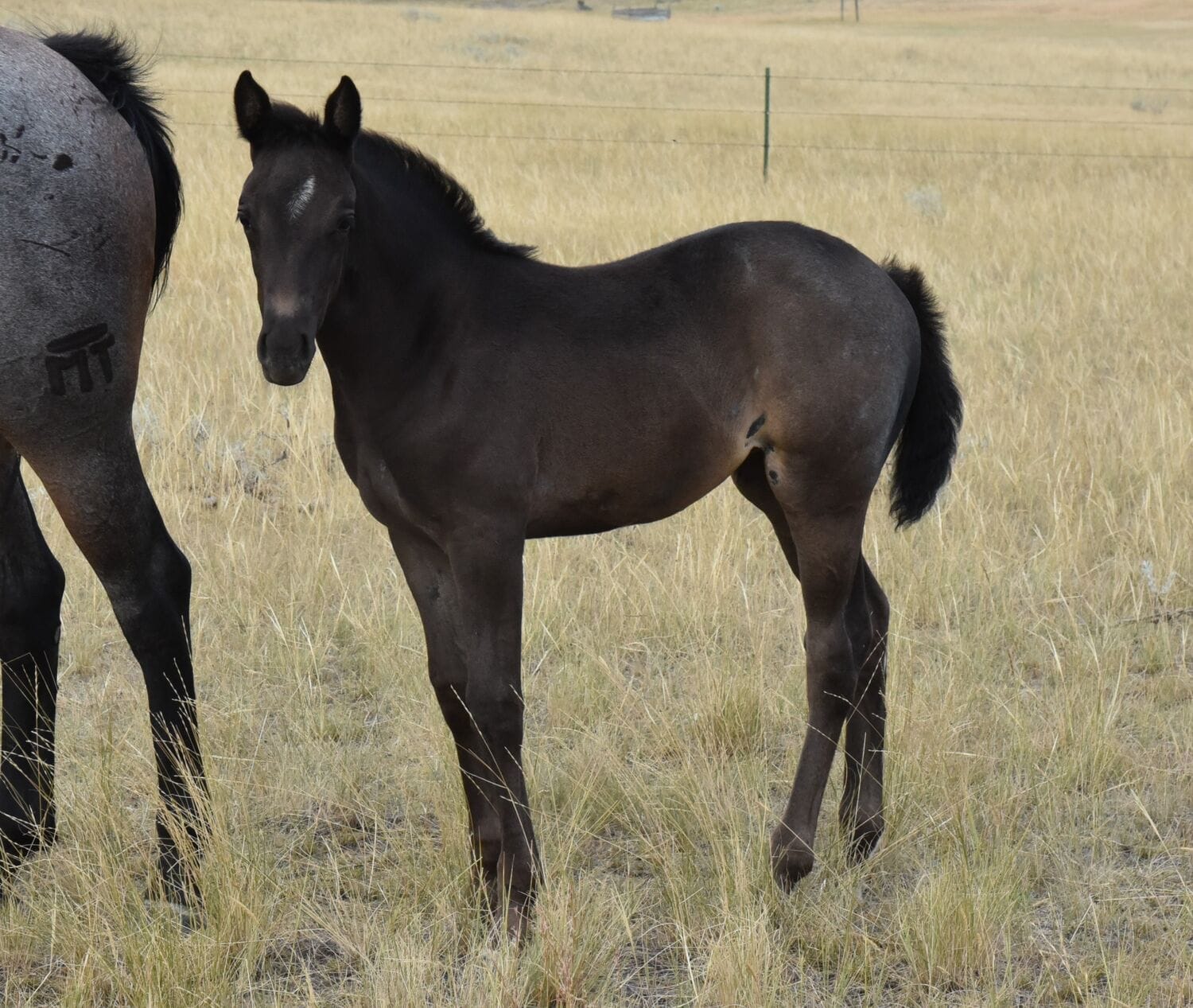 The last foal of the year and we end with a BANG! This is a dolly – a soft pretty blue with sweet eyes. She is curious, catty, and smart. Dezzie as we call her dam is generally one of the last to foal each year. She produces smart, shapey, standouts. This filly has a full brother standing at stud in Canada and a sister coming into our program – super sweet and good to work with! This exquisite filly is tested as homozygous black. 5 panel: N/N, MYHM: N/My, Color: E/E, a/a, nd2/nd2, Rn/N, parentage verified with AQHA.