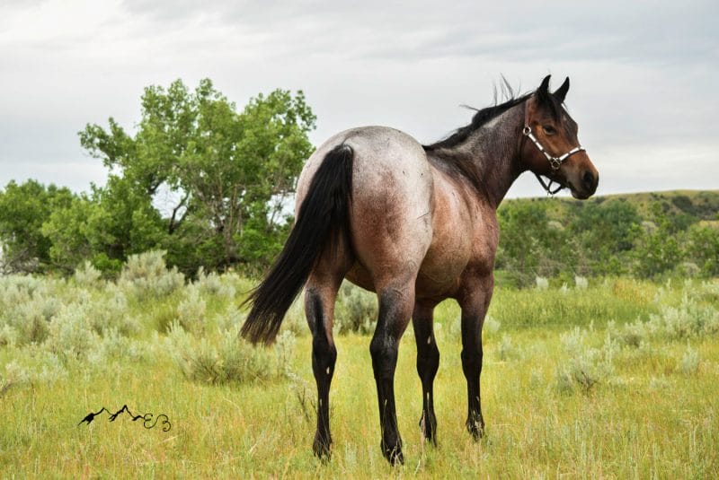 “Irish” as we call him, is the perfect next step for our program. We are always watching bloodlines and for the young stallions that might be a fit for us. It is a neat story how Irish came to us and someday Tana will probably tell you about it, but in the meantime, we just know that he is the stallion God wanted us to have. You couldn’t ask for a prettier head on a horse! Irish brings in the same foot, bone, roan color, and SWEET DISPOSITION for which our horses are known. He was well started under saddle when he came to us the end of May, 2020. Tana can go hop on him anytime and he is such a good boy. He’s smart, smooth, and handles like an old broke horse. We use this young horse for work on the ranch and are pleased with his quiet demeanor and grit for doing a long day’s work. He was a tough little guy. His offspring are just getting started under saddle and they have been fantastic! We’ve had only great reports.